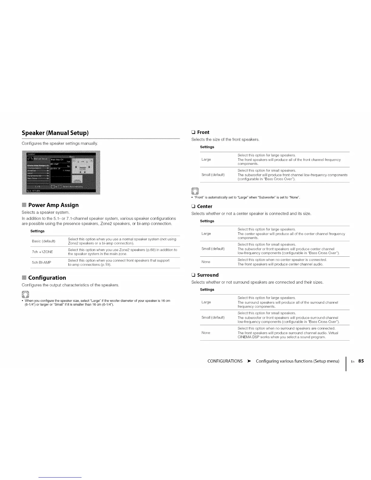 Selects whether or not surround speakers are connected and their sizes.