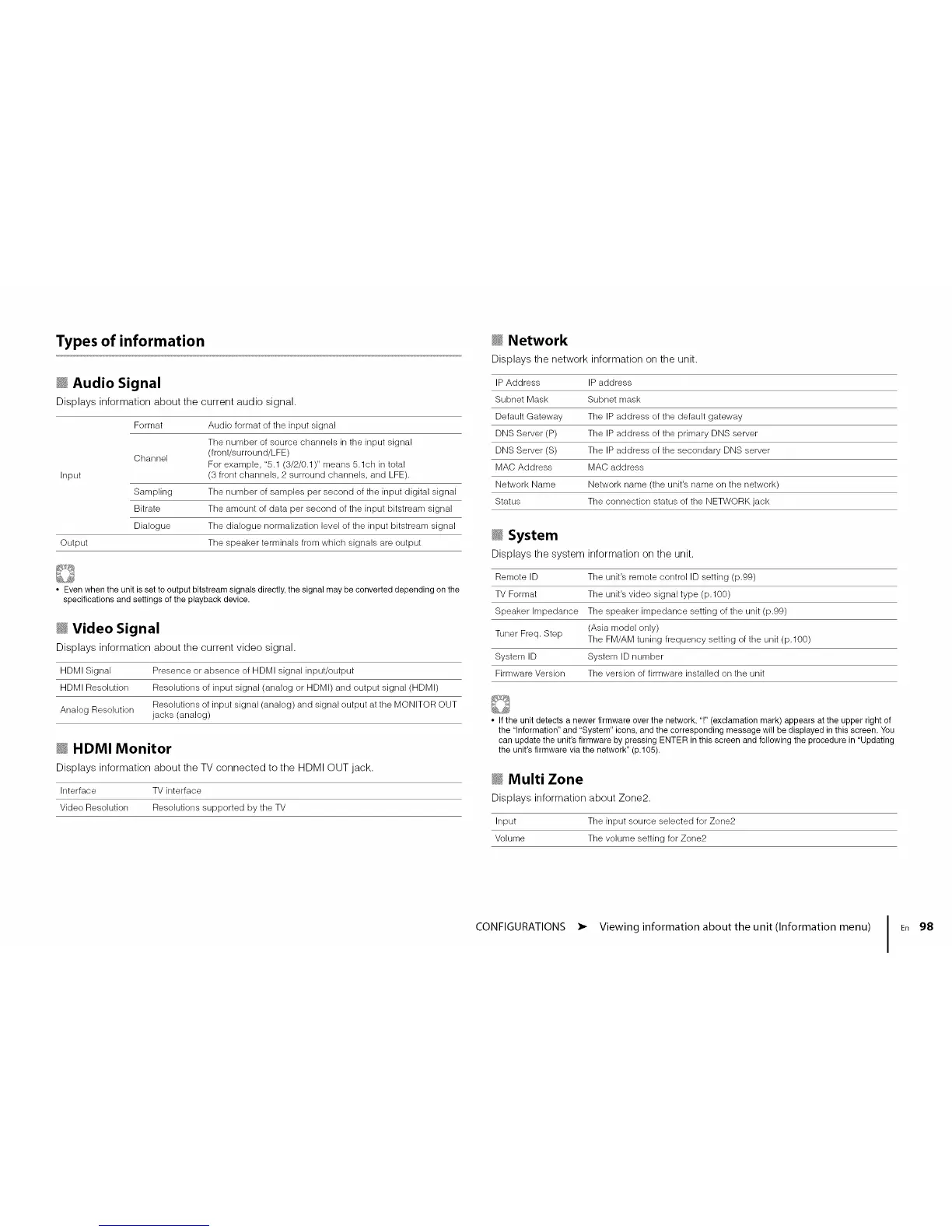 CONFIGURATIONS • Viewing information about the unit(Information menu) I En 98