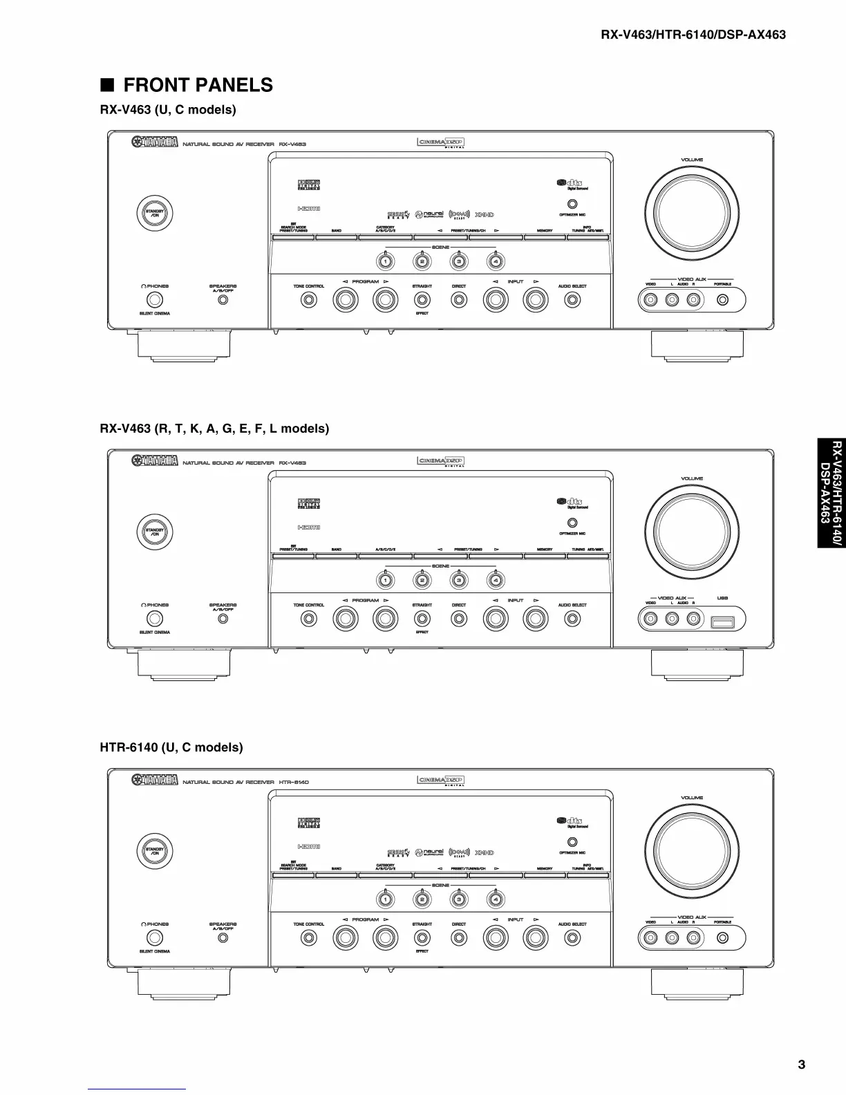 Yamaha RX-V463 - Front Panel Views; RX-V463 (U, C models) Front Panel; RX-V463 (R, T, K, A, G, E, F models) Front Panel; HTR-6140 (U, C models) Front Panel