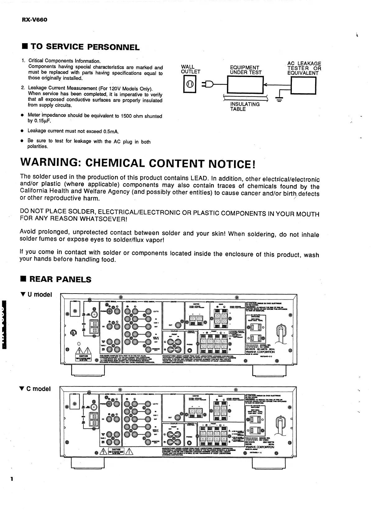 Yamaha RX-V660 - TO SERVICE PERSONNEL; REAR PANELS