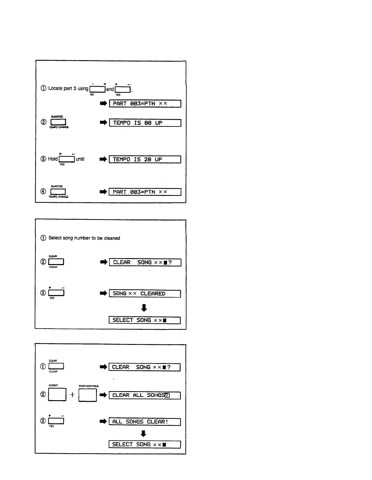 Yamaha RX15 - Programming Tempo Changes Reference; Song Clear (Single) Reference; Song Clear (All Songs) Reference