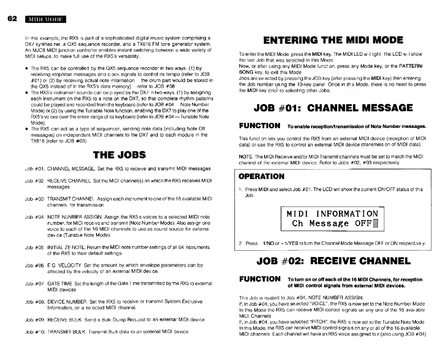 Yamaha RX5 - THE JOBS Ee; Job #04: Note Number Assign; Entering the MIDI Mode; Job #01: Channel Message