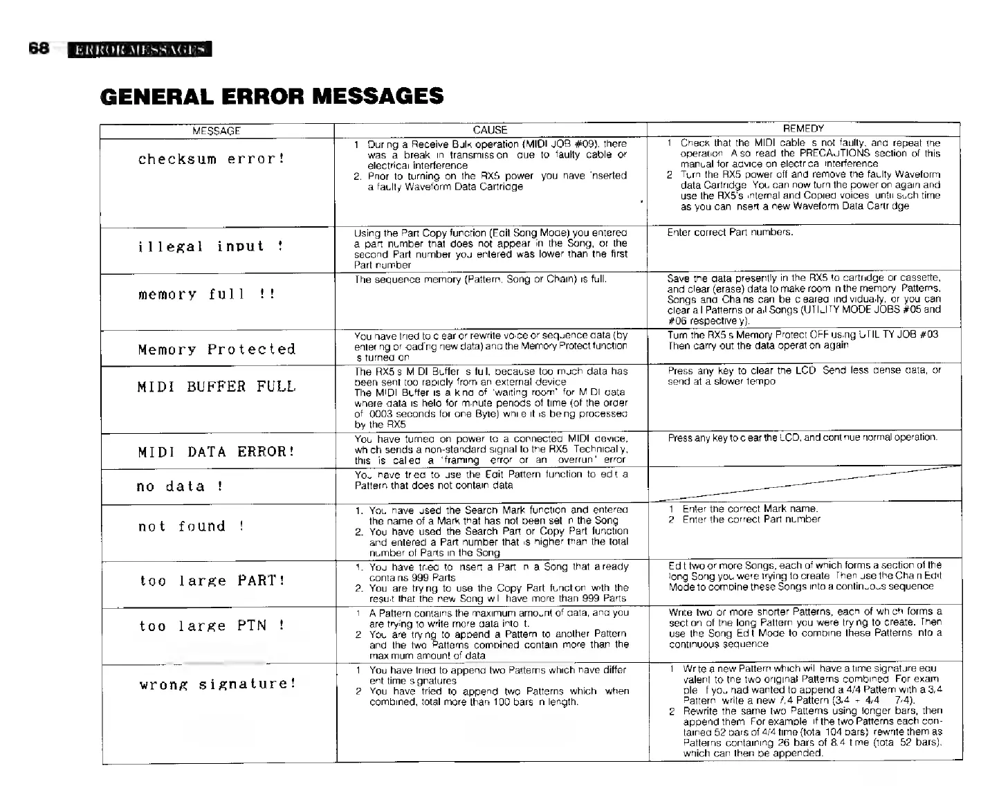 Yamaha RX5 - General Error Messages; Buffer Full; Data Error
