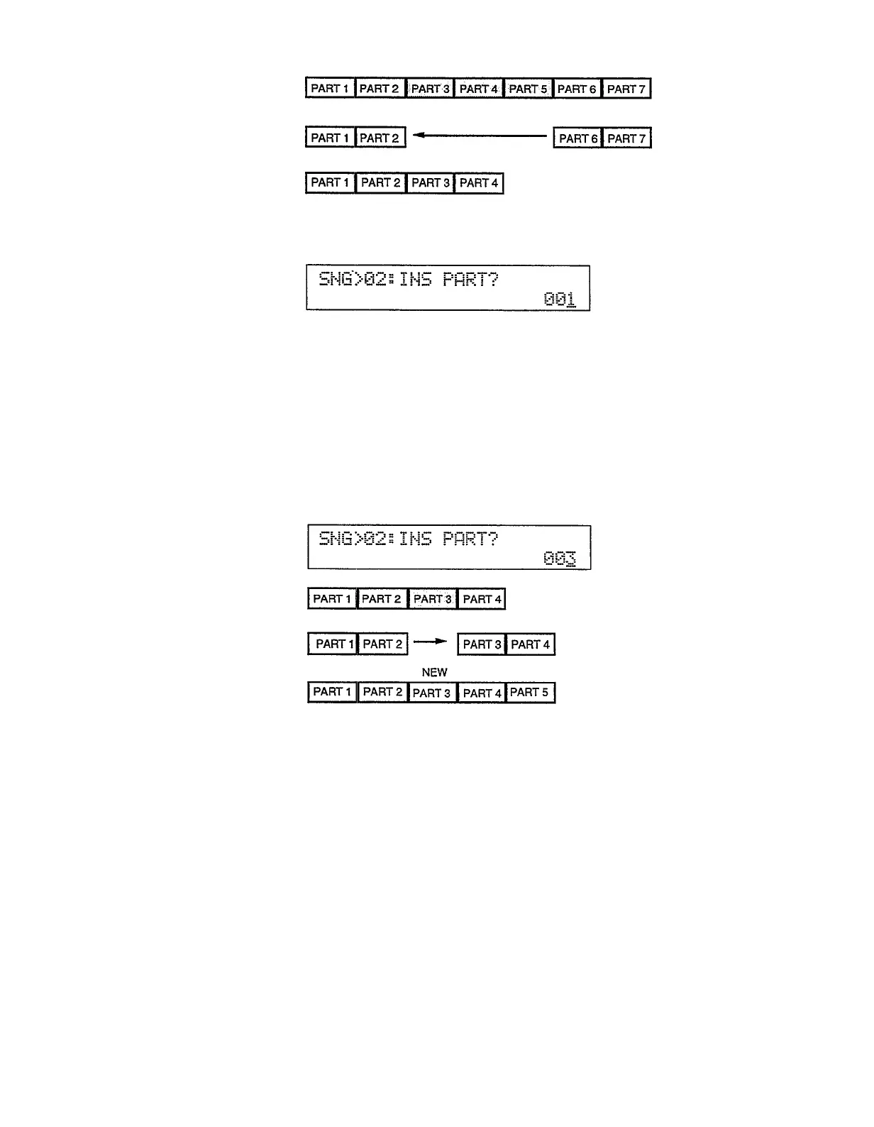 parts are moved up, leaving space for a new part 3 which should be recorded