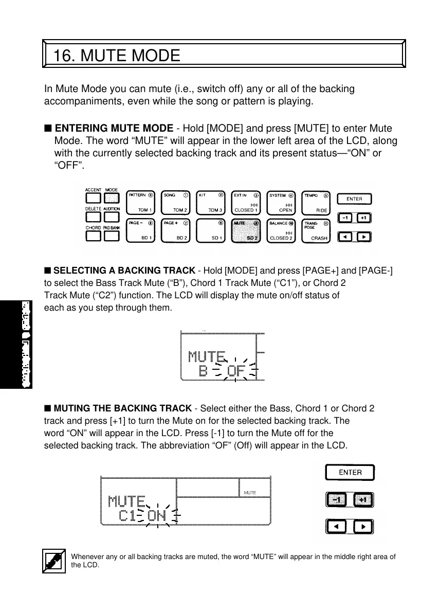 Whenever any or all backing tracks are muted, the word “MUTE” will appear in the middle right area of