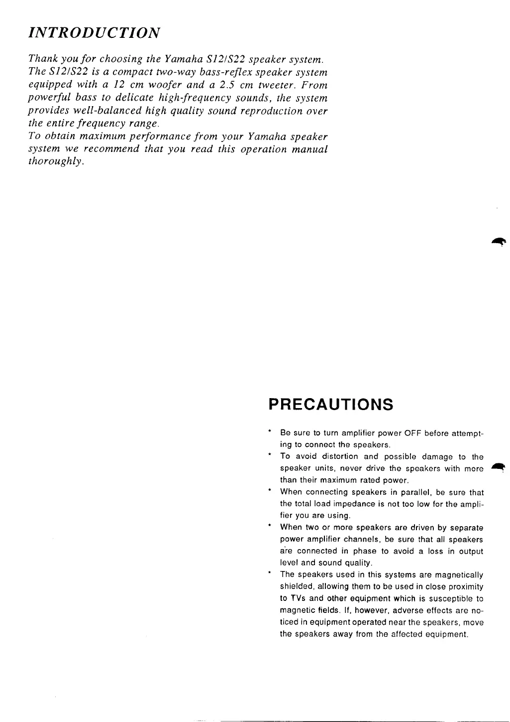Yamaha S12 - INTRODUCTION; PRECAUTIONS