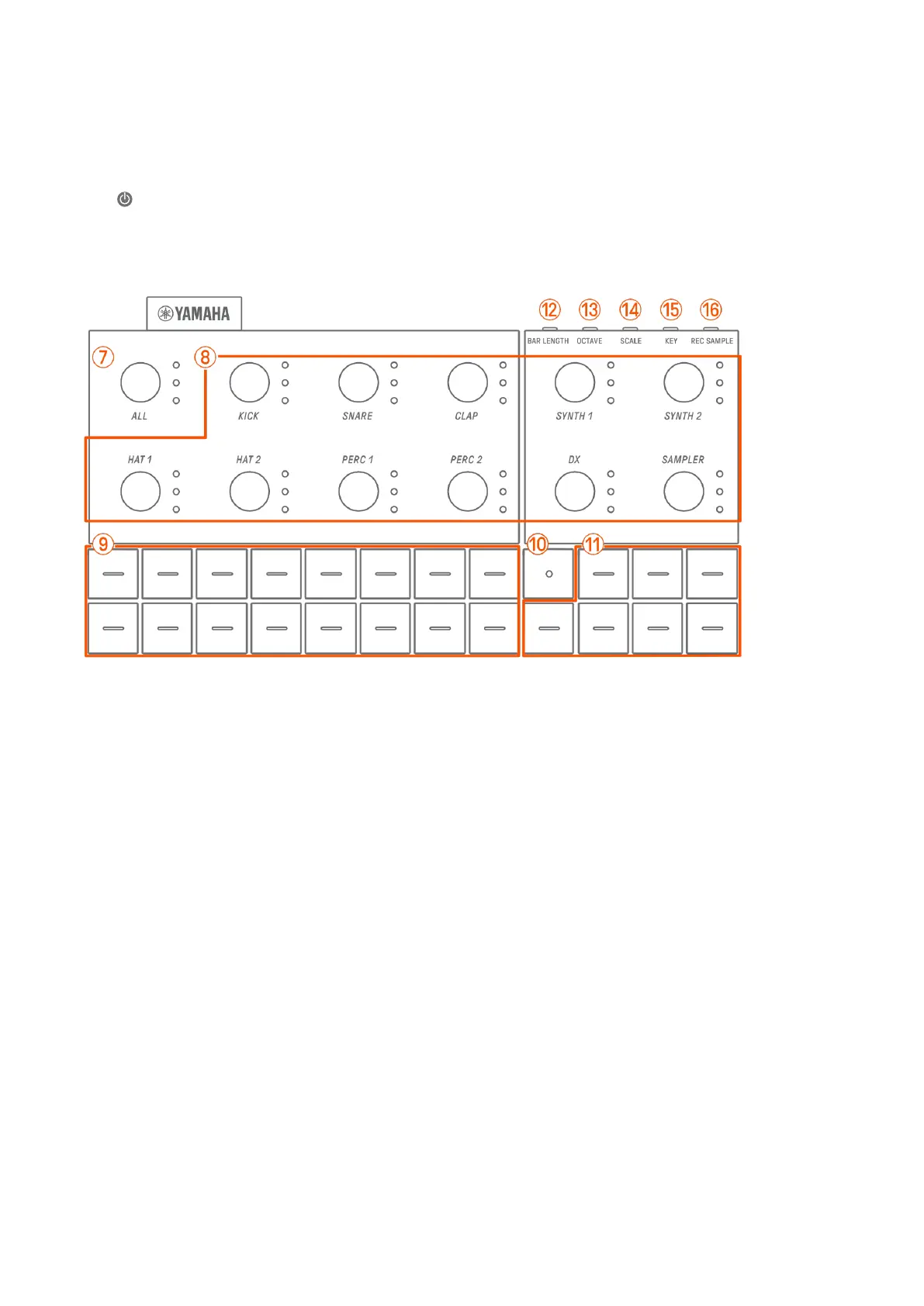 Turn these knobs to change the pattern for each individual track. Press to select a track.