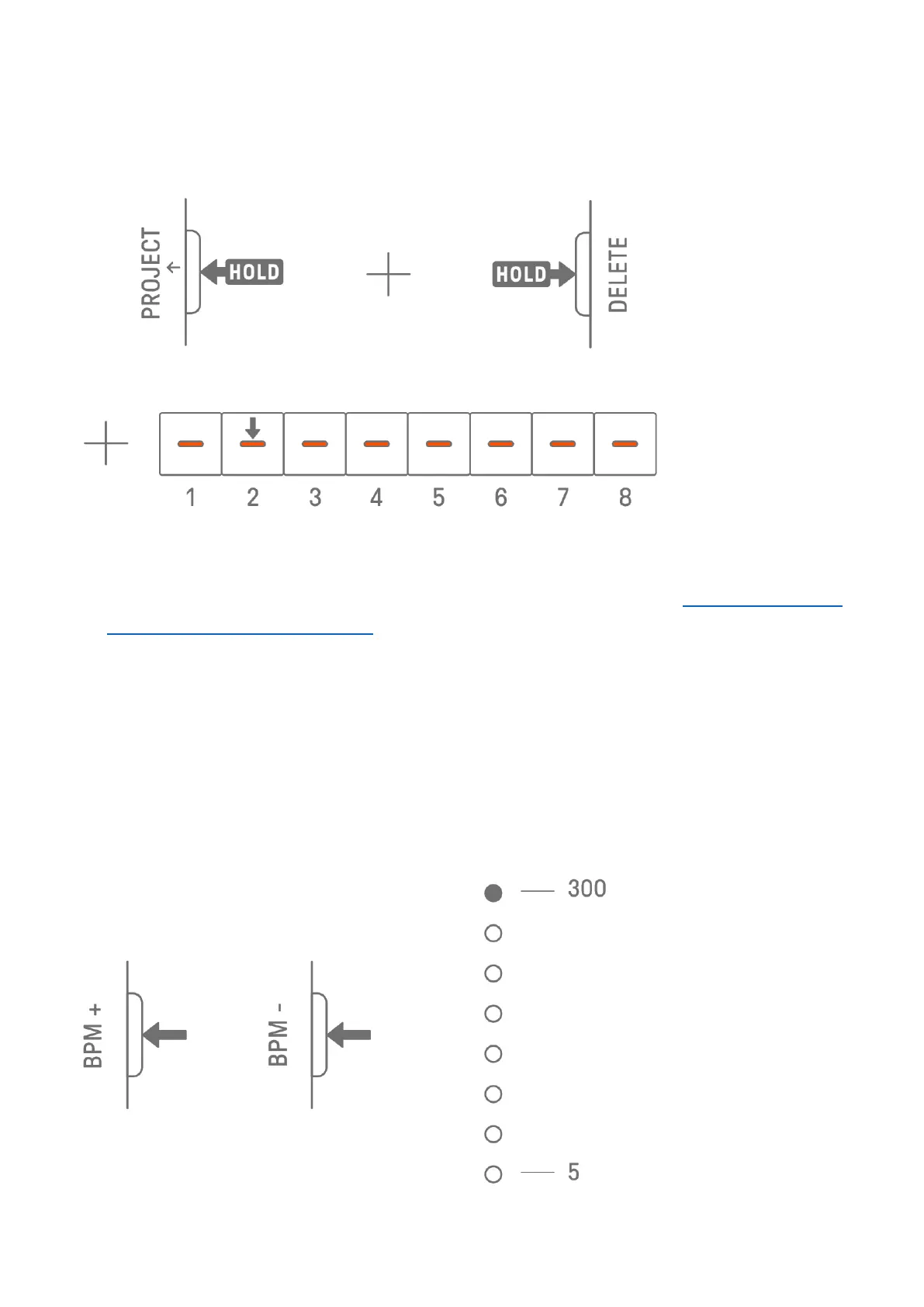 can be adjusted between 5 and 300 BPM. Press and hold the [BPM+] or [BPM−] button to