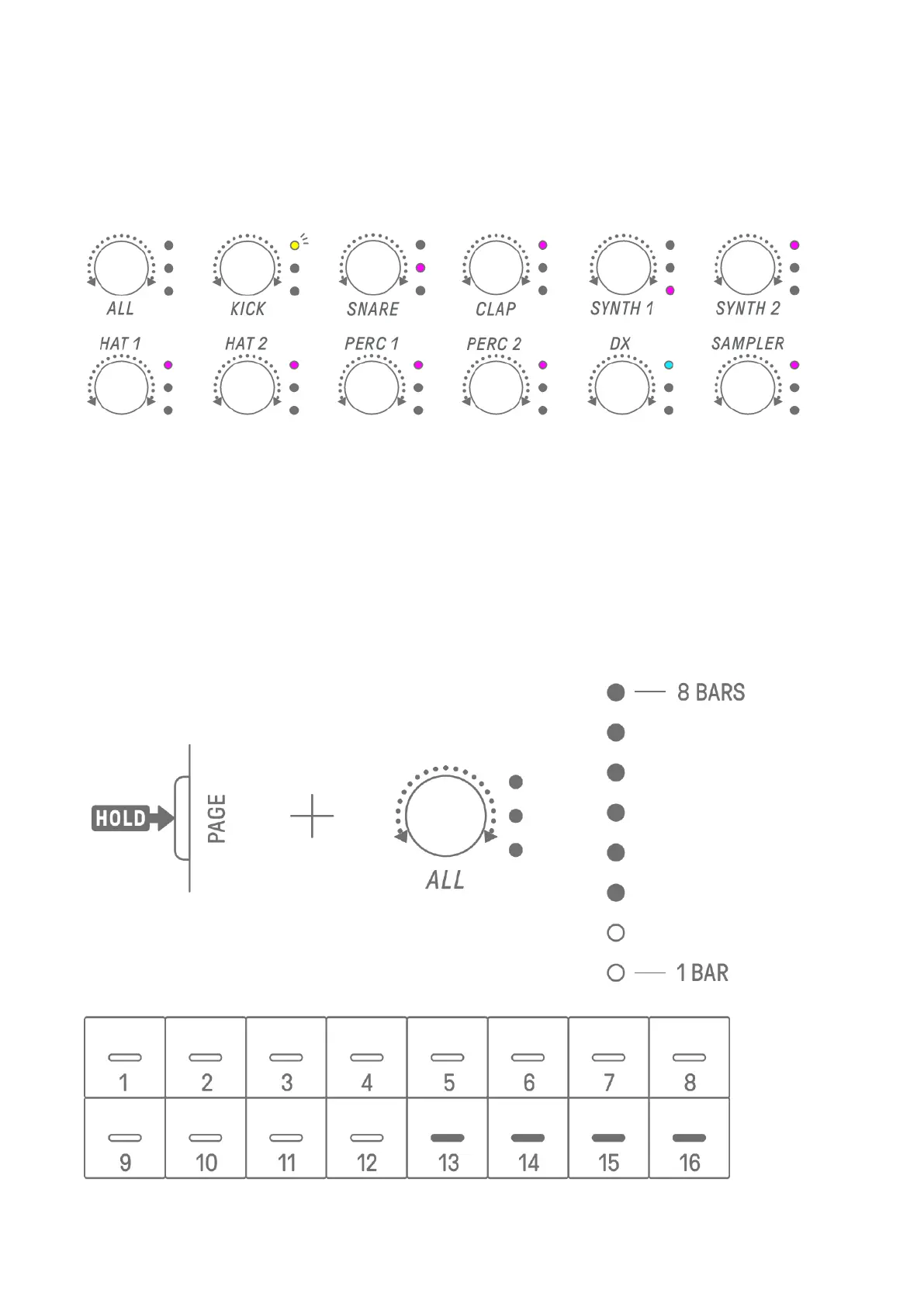 In Song mode, hold down the [PAGE] button and turn the [ALL] knob to change the length of