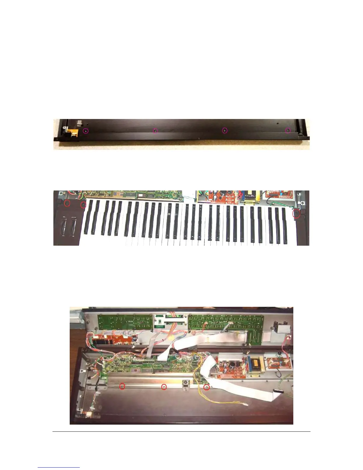 Loosen the 3 internal screws at the extreme right and left ends that hold the keybed in