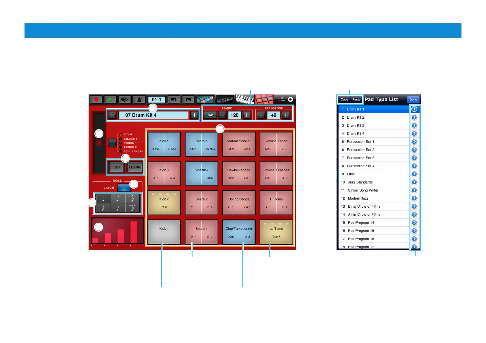 This display lets you play the Drum sounds of the synthesizer. Select a Drum Set (2), then tap the desired Drum Pads on the display.