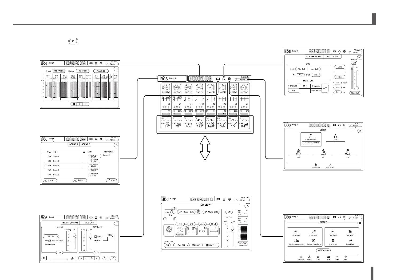 You can view the following screens by touching the buttons in the OVERVIEW screen. To return to the OVERVIEW screen,