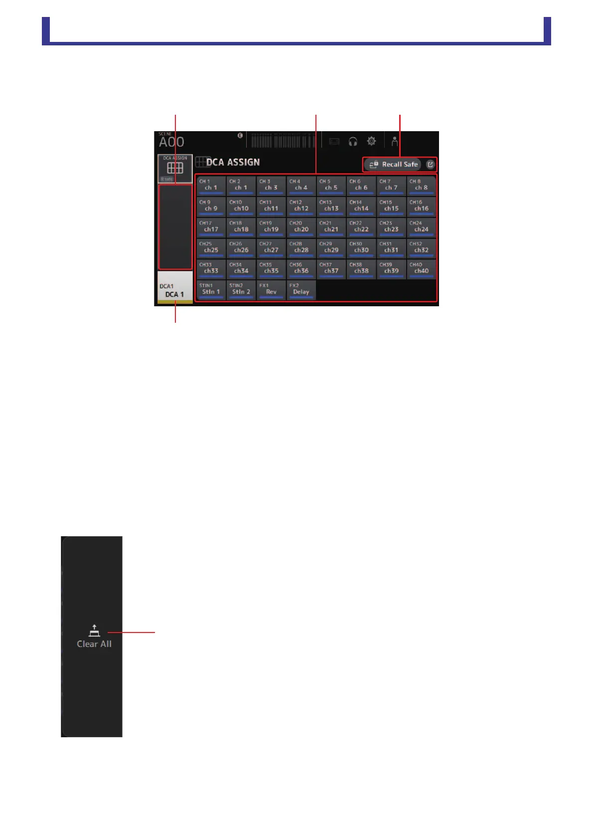 Member channels of selected DCA group assigned to these channel strips