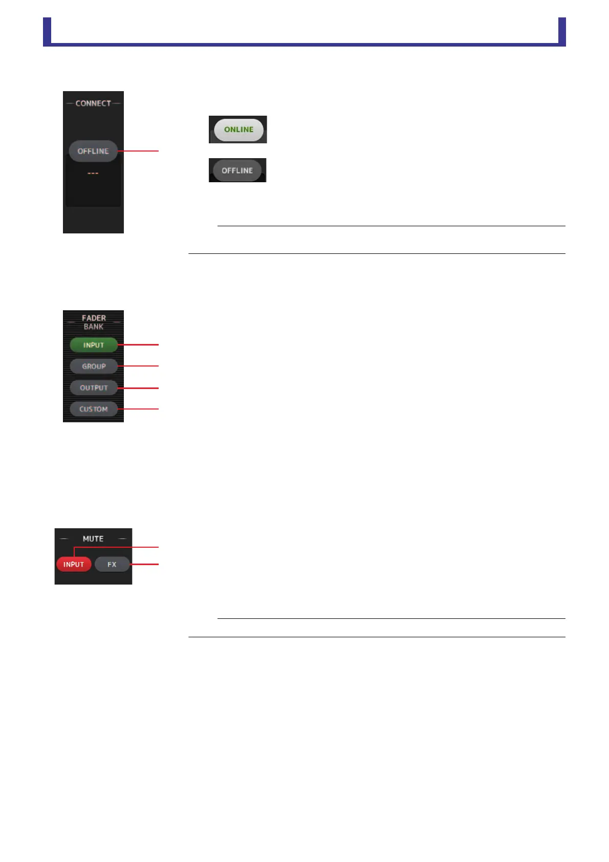 Mutes the console's FX module. Insert effects assigned to AUX 9/10–19/20 will be