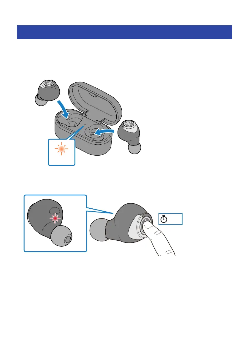 If the earphones have been removed from the charging case, hold down the function key on each earphone (L, R) until their