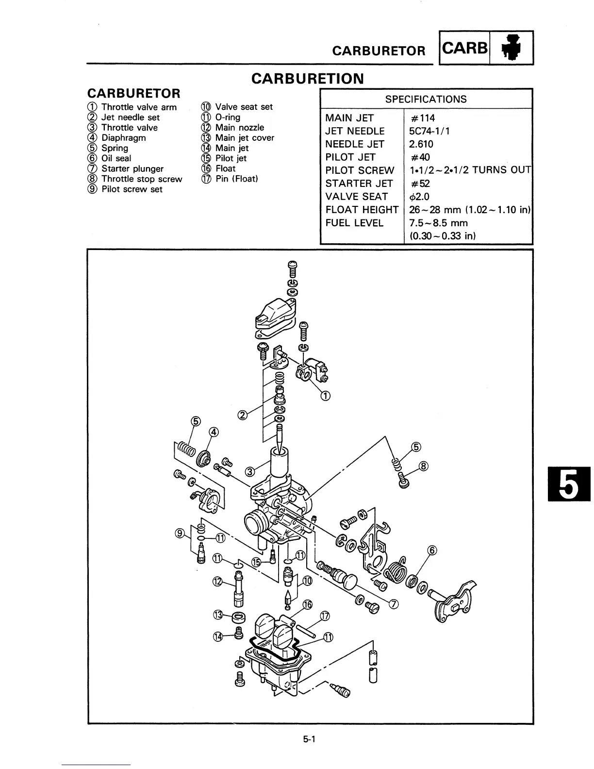 Yamaha TW200/E - Carburetion; Carburetor Specifications
