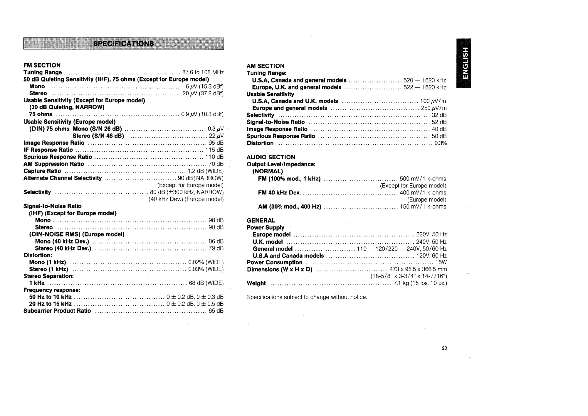 Yamaha TX-2000 - SPECIFICATIONS; FM and AM Specifications; Audio and General Specs