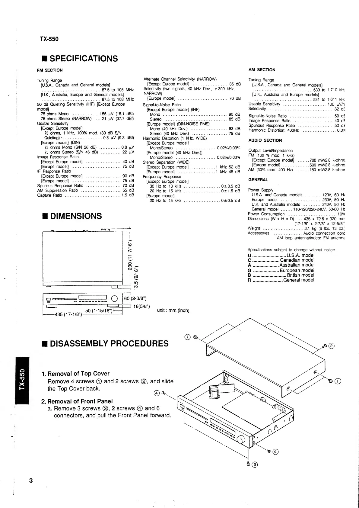 Yamaha TX-550 - Technical Specifications; Unit Dimensions; Disassembly Instructions