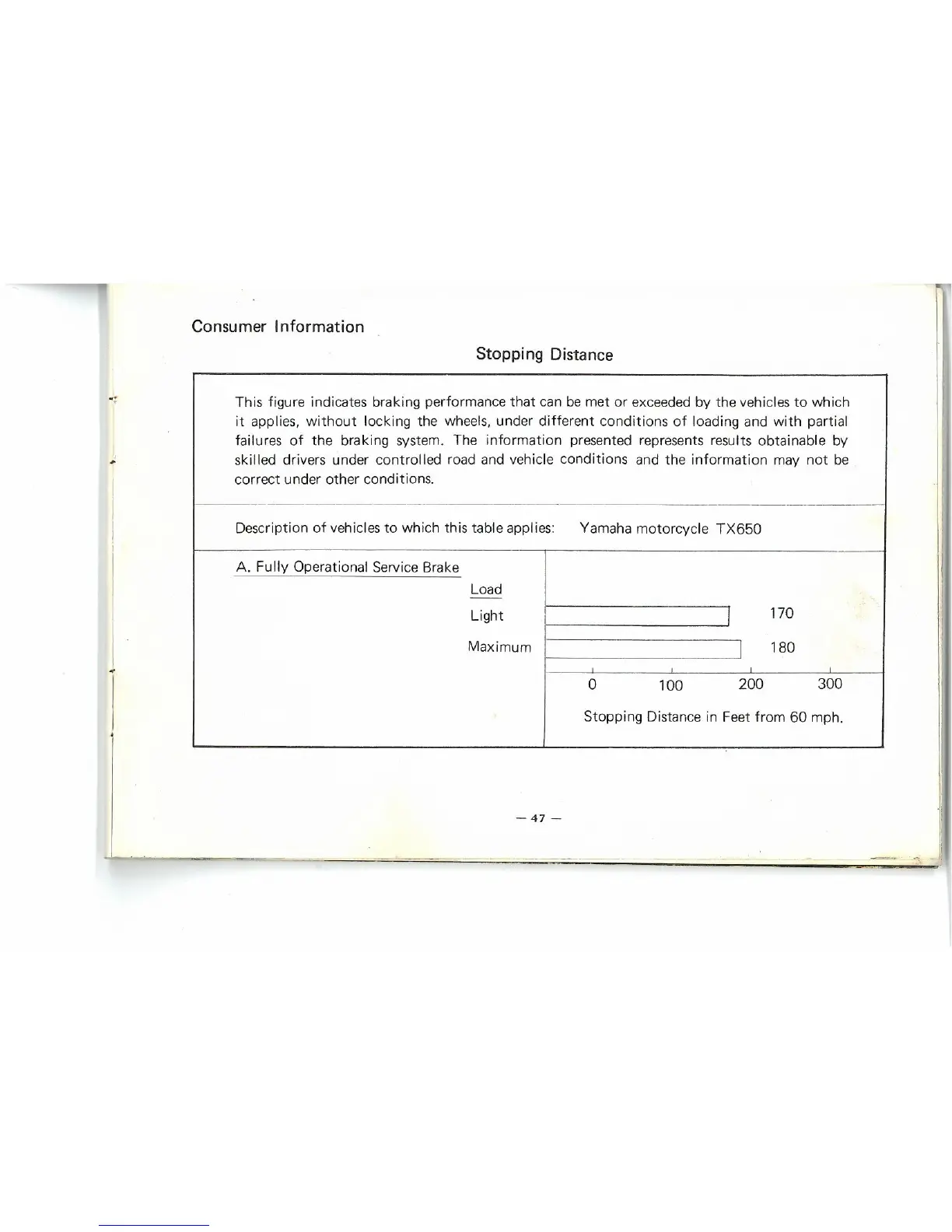 Yamaha TX650 - Consumer Information; Stopping Distance
