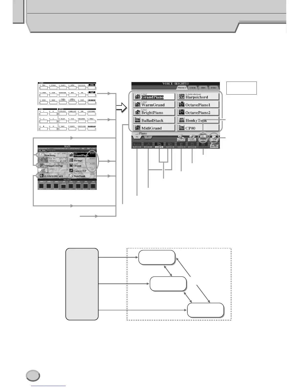 The voice selection, style selection, and song selection displays described in the Quick Guide are all Open/Save displays. This