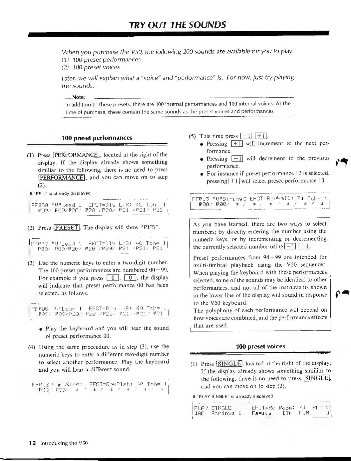 Yamaha V50 - Try out the SOUNS; Ee Eeeeceeeeeeeeeeereeeeteenneeeeetees; Preset Performances; 100 Preset Voices