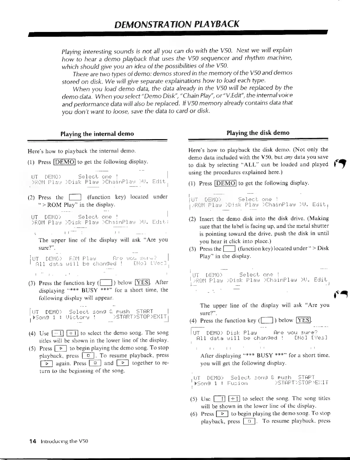Yamaha V50 - A Demonstration Playback; Playing the Internal Demo Csecsen; Playing the Disk Demo N