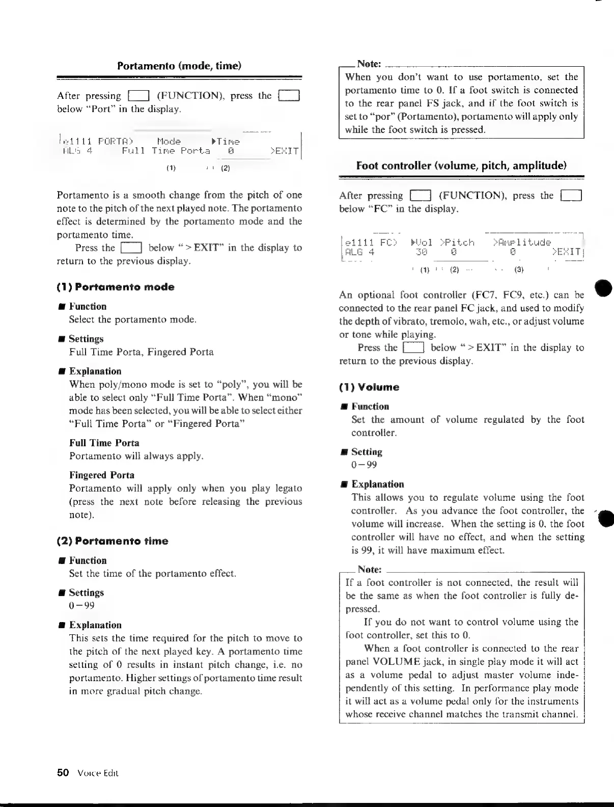 Yamaha V50 - Portamento (Mode, Time); Foot Controller (Volume, Pitch, Amplitude)