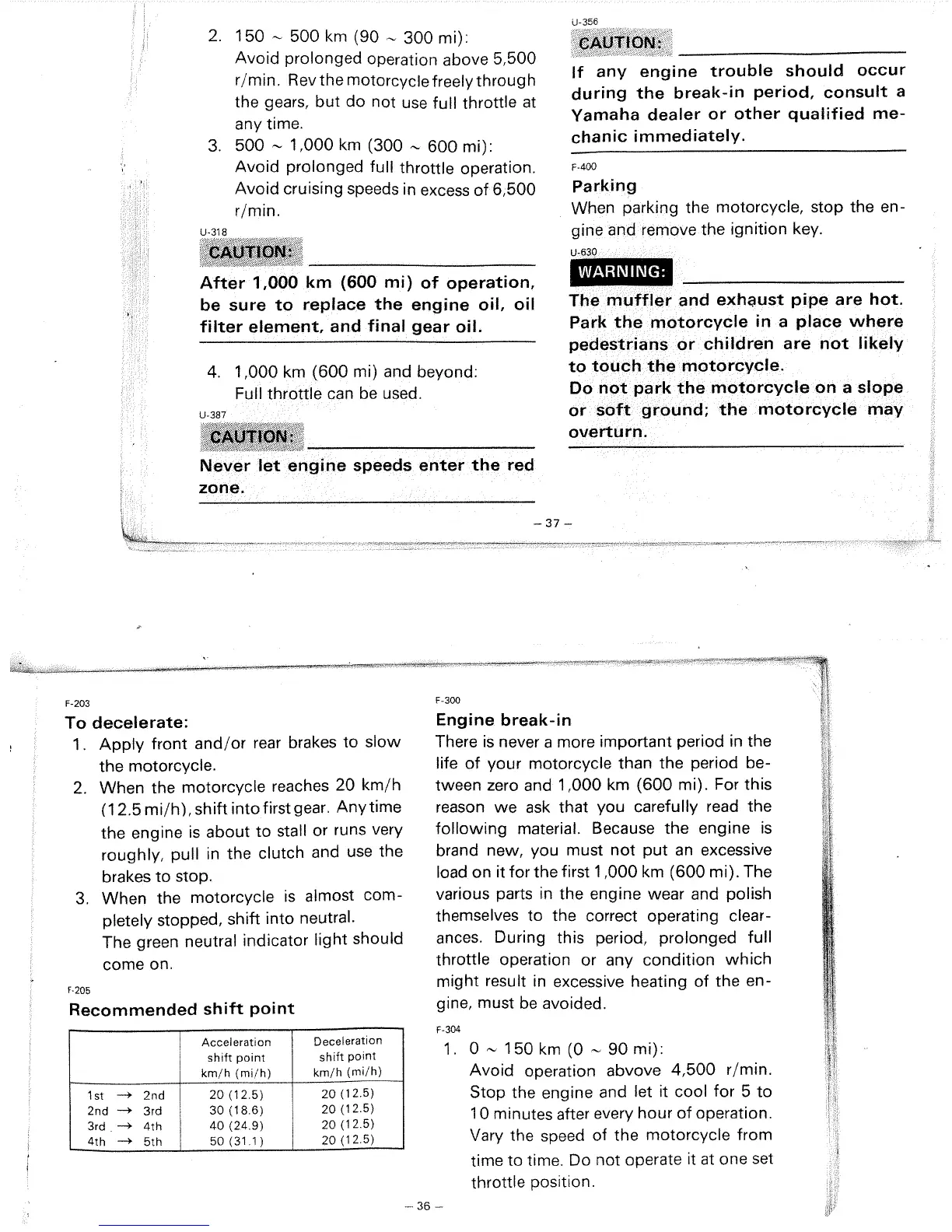 Yamaha XJ700N - Riding Performance; Deceleration Procedure; Recommended Shift Points; Engine Break-in Procedure