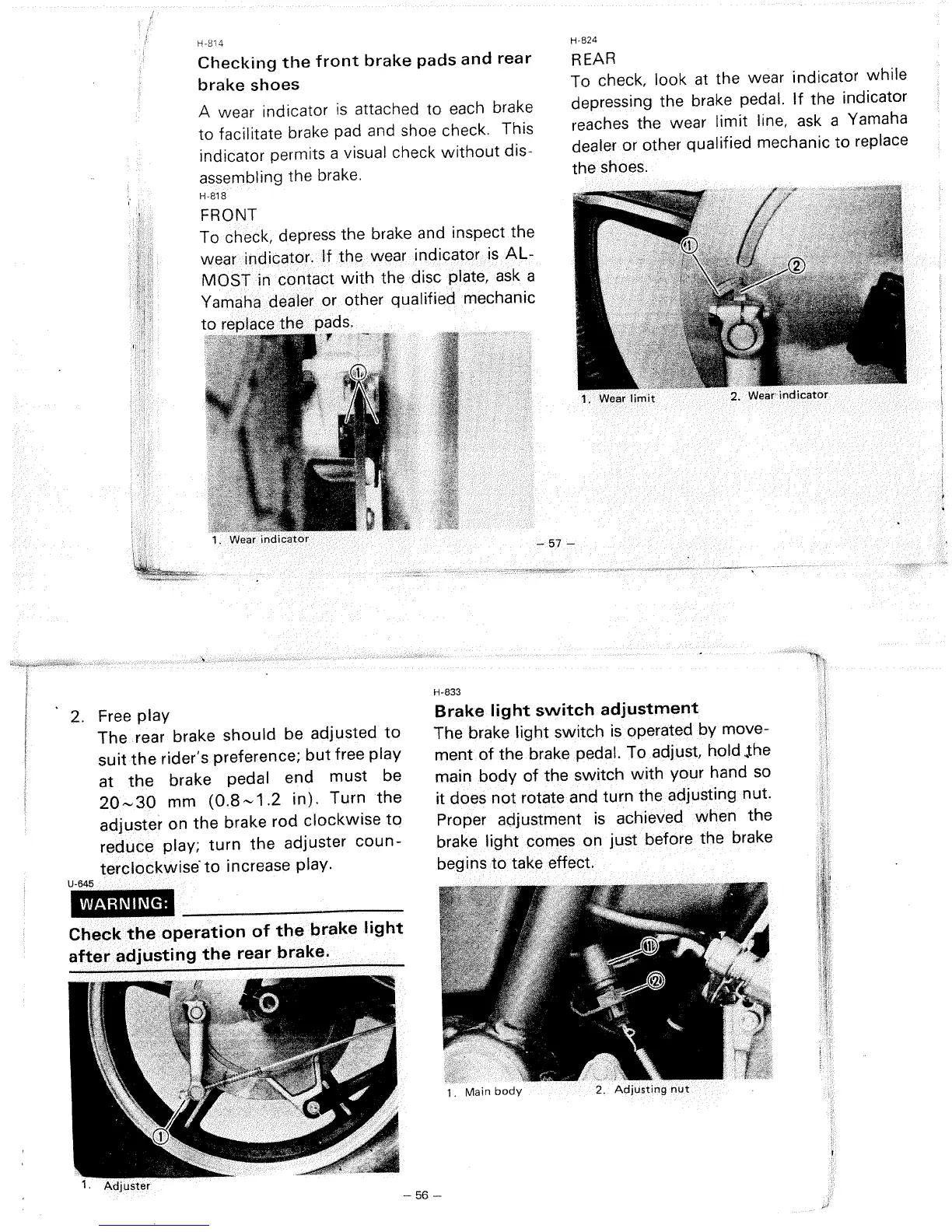 Yamaha XJ700N - Brake System Inspection and Adjustment; Brake Pad and Shoe Wear Check; Brake Light Switch Adjustment