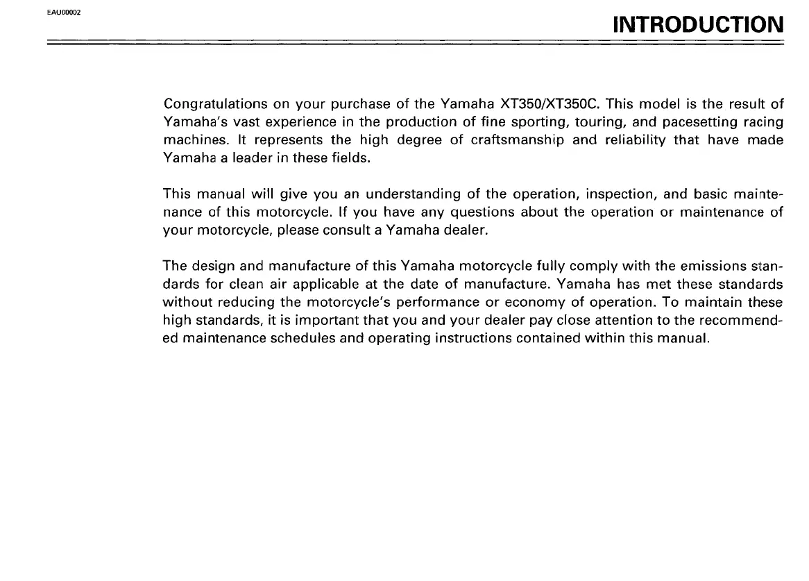 Yamaha XT350M - Introduction to Yamaha Motorcycle Manual