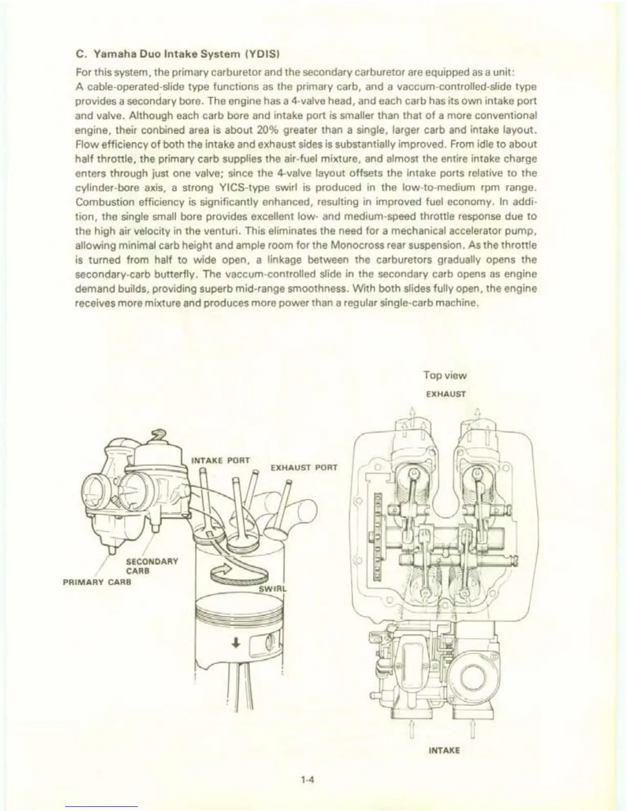 allowing minimal carb height and ample room for the Monocross rear suspension. As the throttle