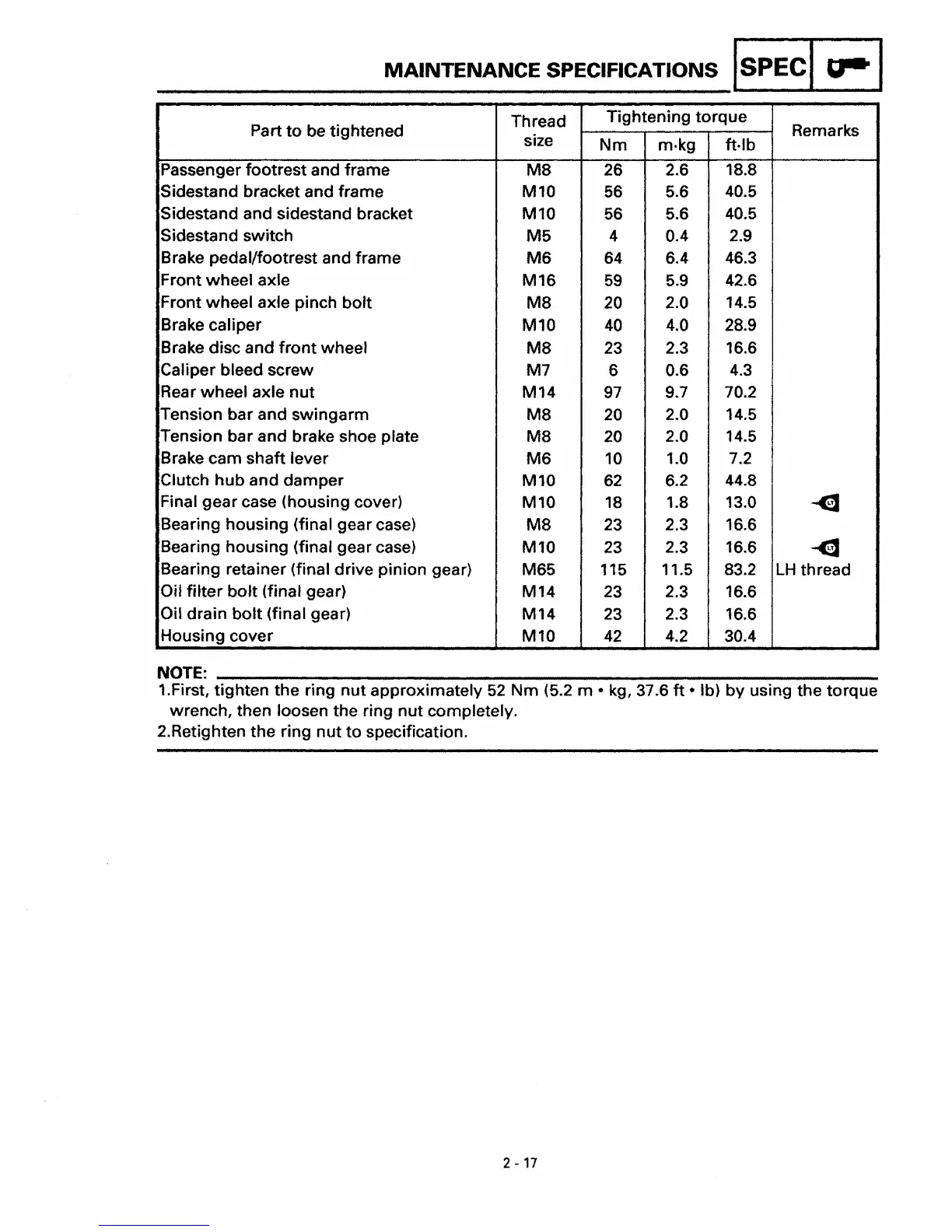 MAINTENANCE SPECIFICATIONS