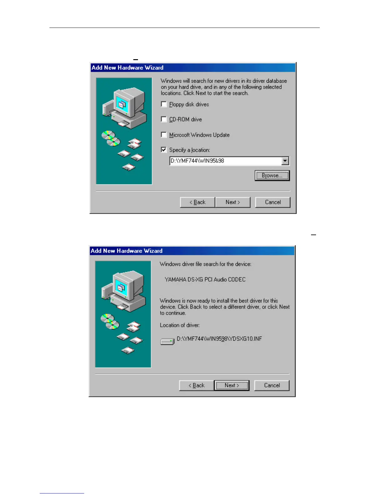 Assuming your CD-ROM drive is D, please type the path D:\YMF744\Win95&98 in the