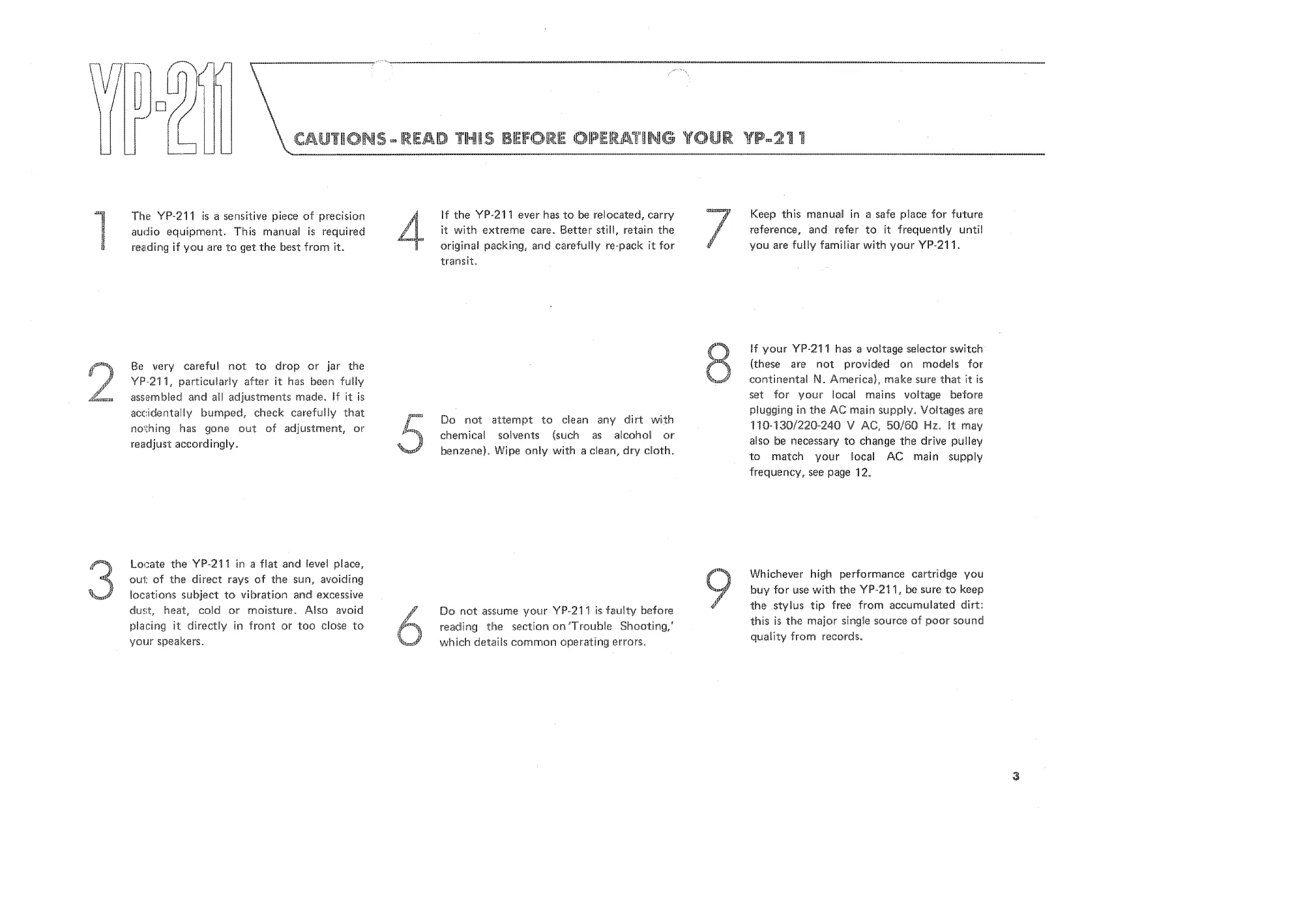 Yamaha YP211 - Cautions and Operating Advice; Handling Sensitive Equipment; Voltage Selector and Mains Frequency