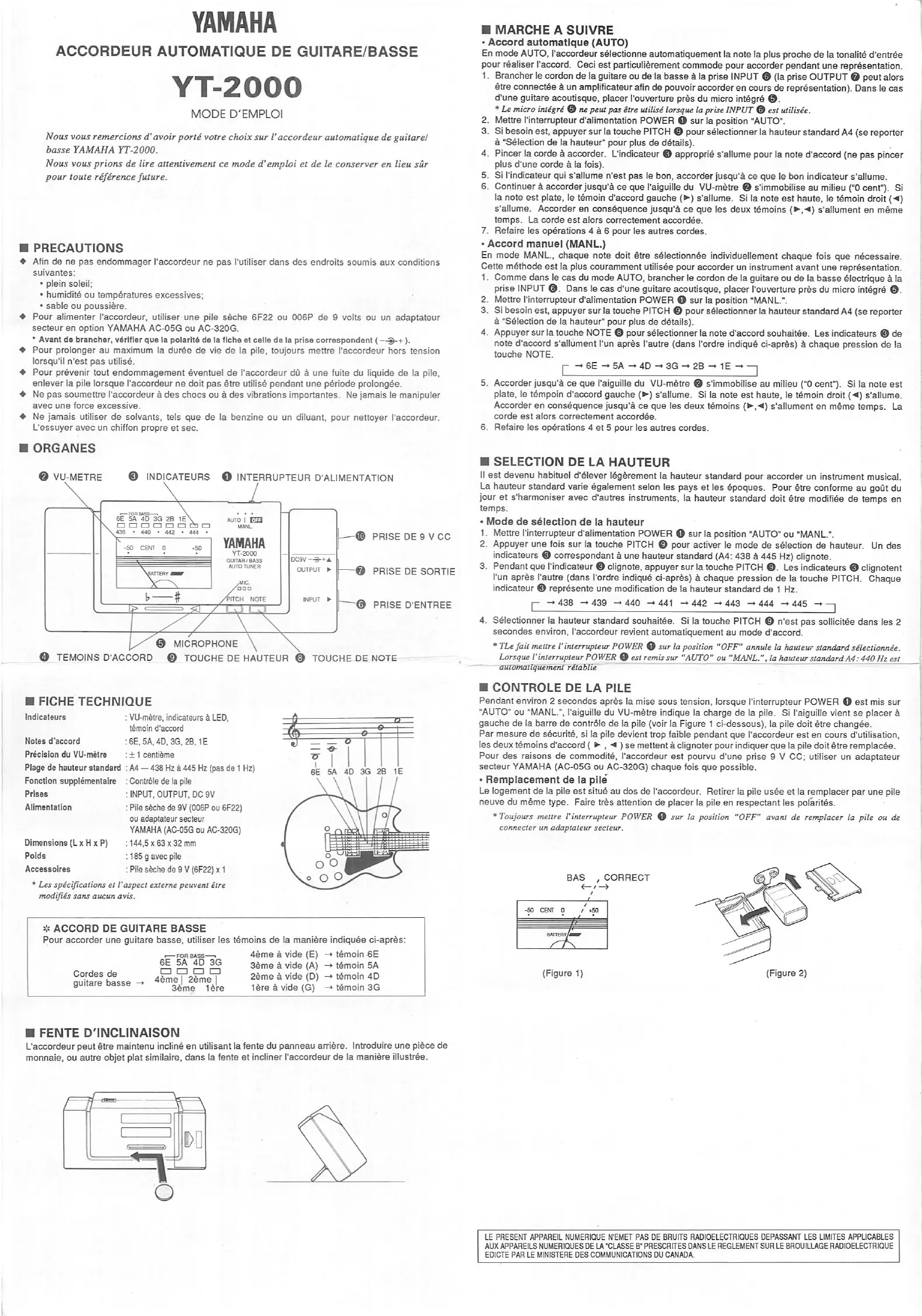 Yamaha YT-2000 - Identification des Composants; Organes de lAccordeur; Procédures dAccordage; Accord Automatique (AUTO)