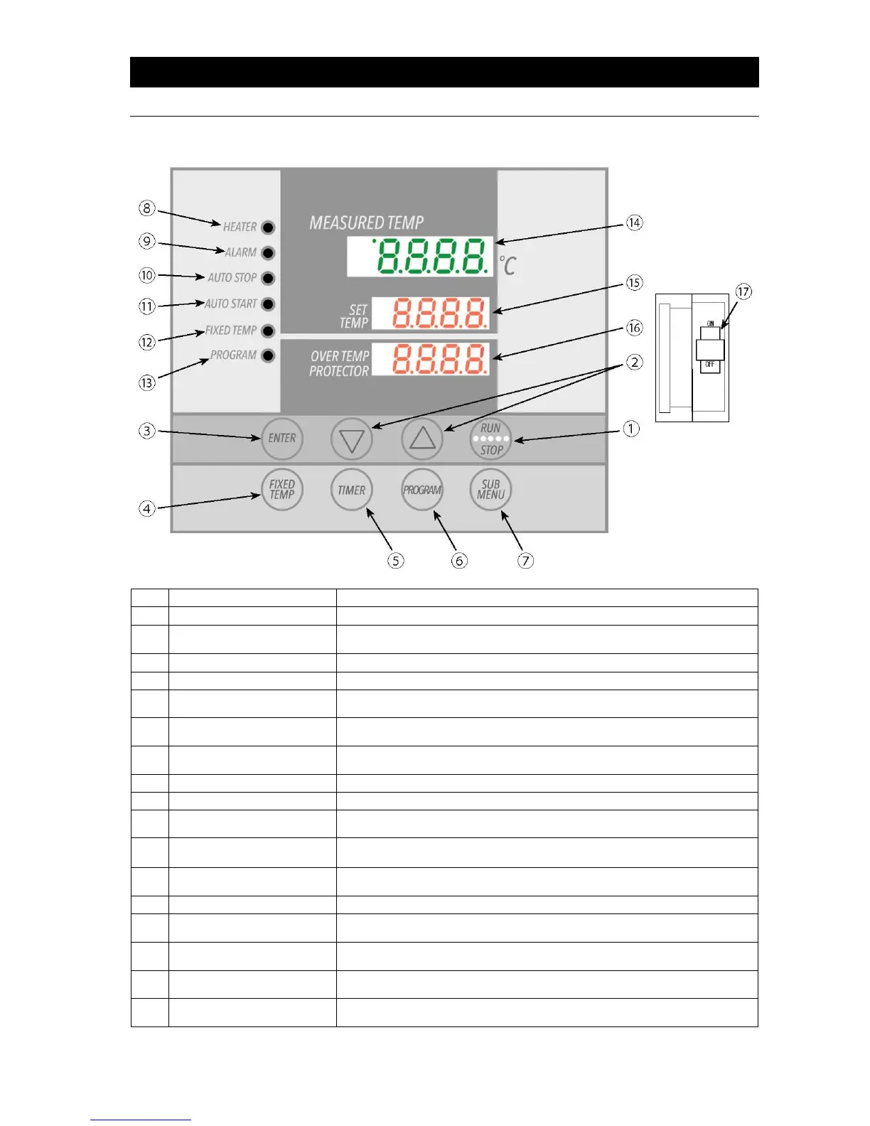 Shows current chamber temperature, setting characters and error information.