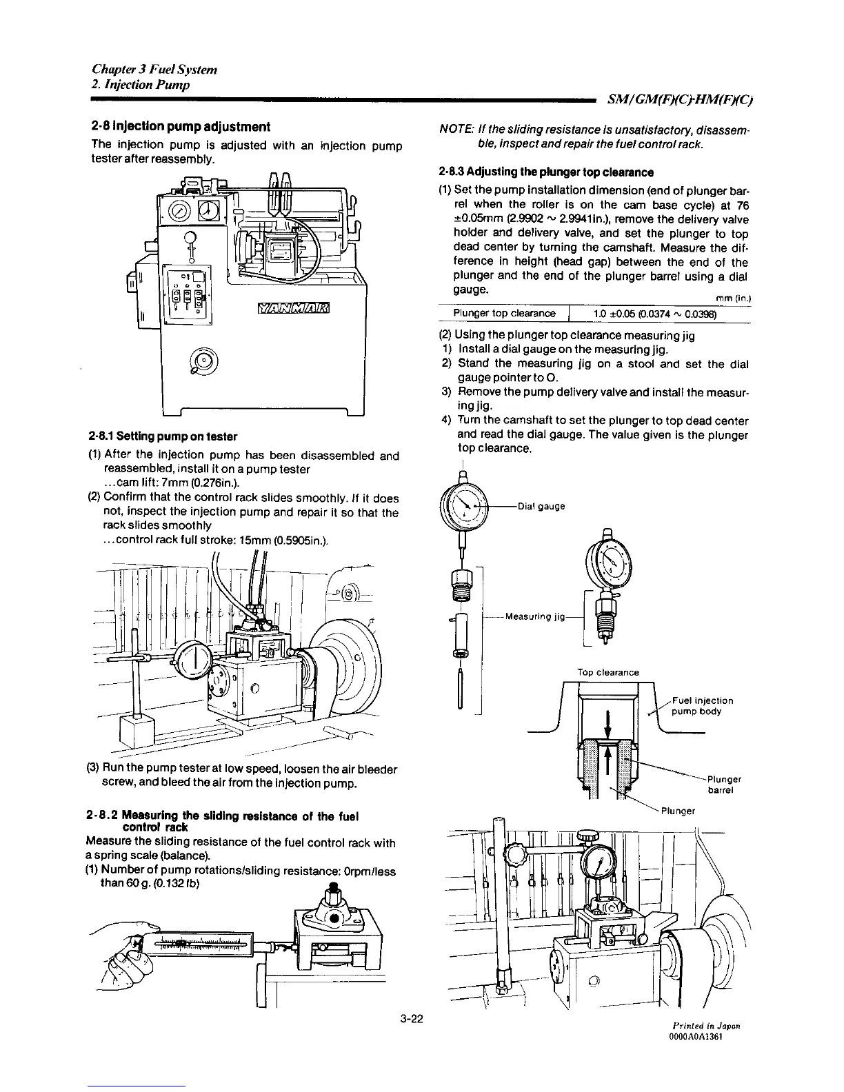 Yanmar 2GM20C - Injection Pump Adjustment; Setting Pump on Tester; Measuring the Sliding Resistance of the Fuel Control Rack; Adjusting the Plunger Top Clearance