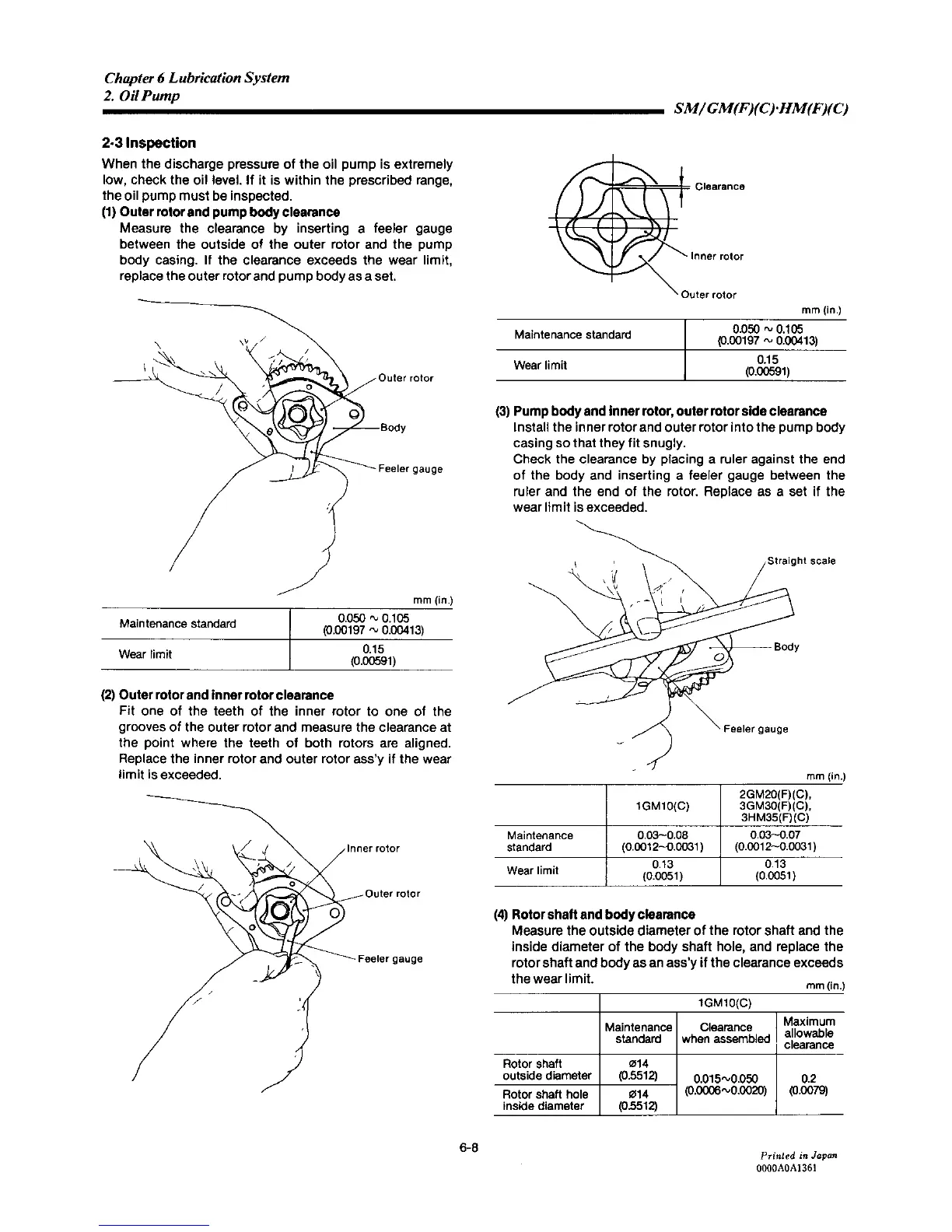 Yanmar 2GM20C - Oil Pump Inspection; Outer Rotor and Pump Body Clearance; Outer Rotor and Inner Rotor Clearance; Pump Body and Inner Rotor, Outer Rotor Side Clearance