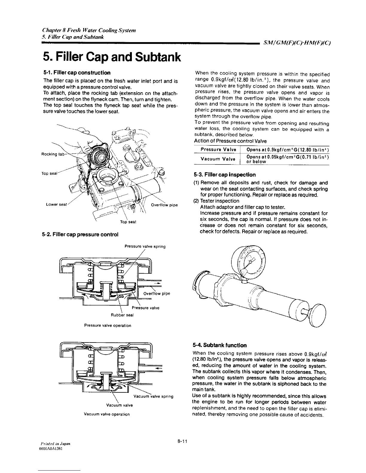 Yanmar 2GM20C - Filler Cap Construction; Filler Cap Pressure Control; Filler Cap Inspection; Subtank Function