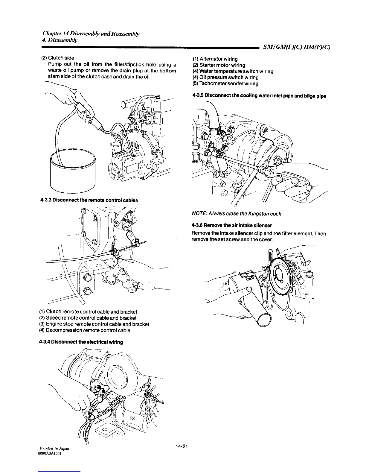 Yanmar 2GM20C - Disconnect the Remote Control Cables; Disconnect the Electrical Wiring; Disconnect the Cooling Water Inlet Pipe and Bilge Pipe