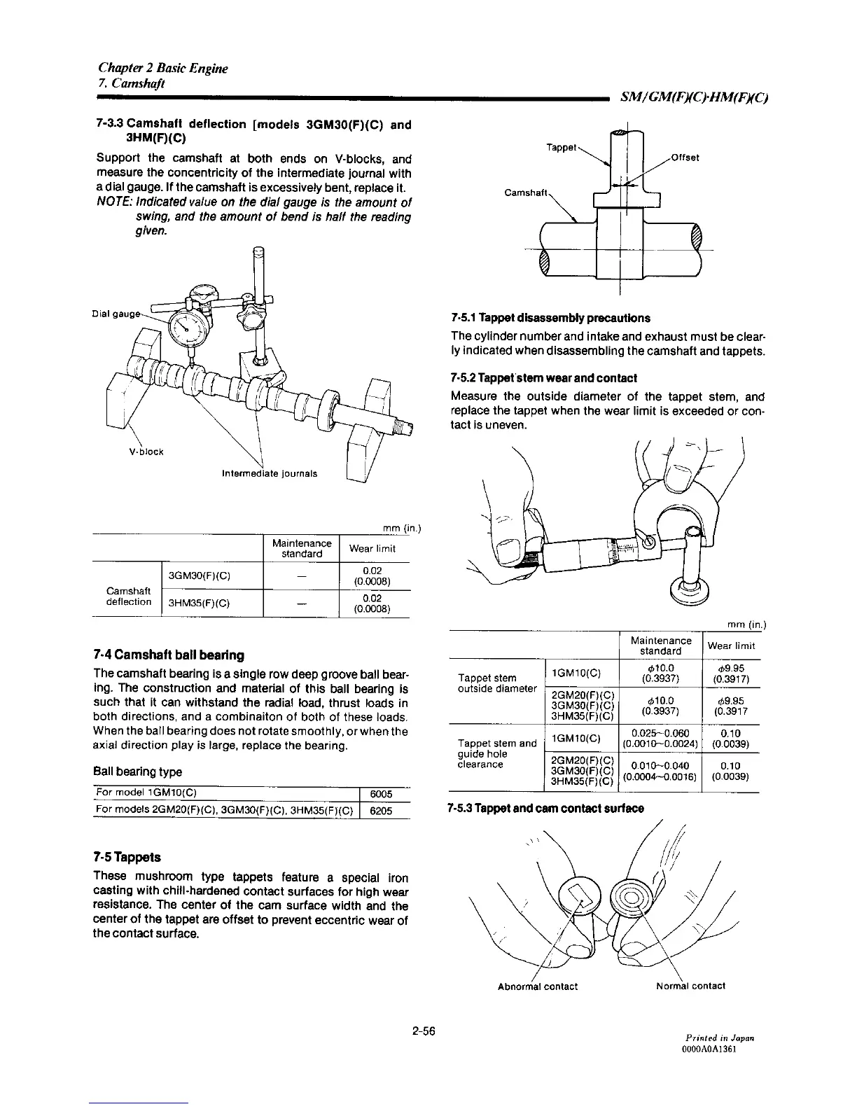 Yanmar 2GM20C - Camshaft Ball Bearing; Tappets; Camshaft Deflection