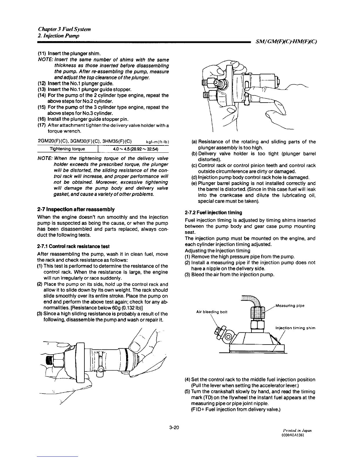 Yanmar 2GM20F - Inspection after Reassembly; Control Rack Resistance Test; Fuel Injection Timing