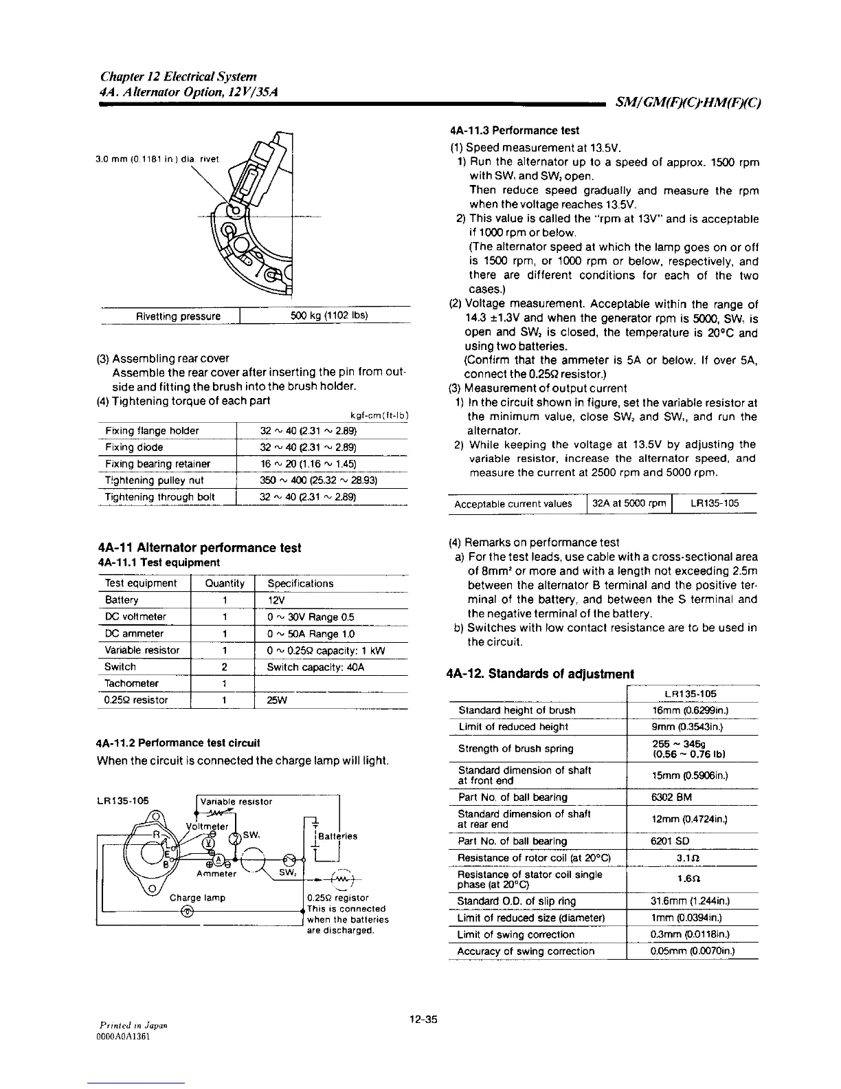 Yanmar 2GM20F - Alternator, Option, 12 V;35 A Performance Test; Alternator, Option, 12 V;35 A Standards of Adjustment
