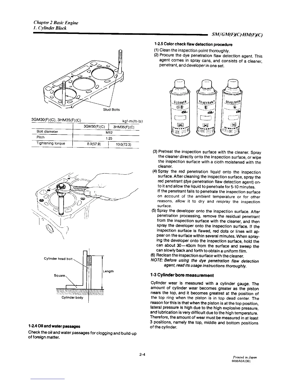 Yanmar 2GM20F - Cylinder Bore Measurement; Oil and Water Passages; Color Check Flaw Detection Procedure