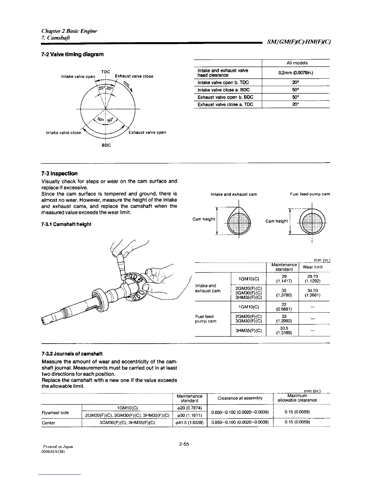 Yanmar 2GM20F - Valve Timing Diagram; Camshaft Inspection; Camshaft Height; Journals of Camshaft