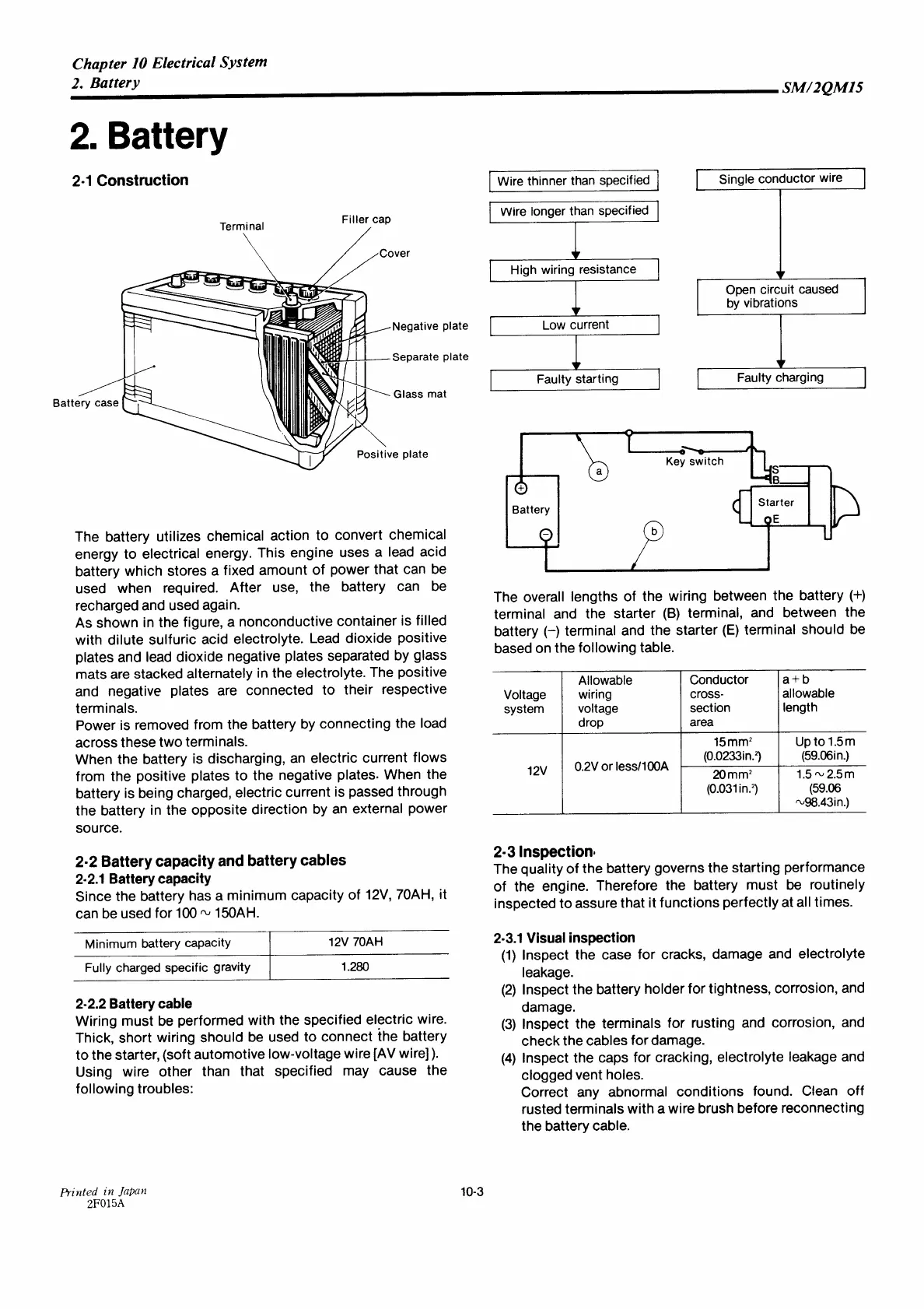 Yanmar 2QM15 - Battery Construction;View; Battery Capacity and Battery Cables; Battery Visual Inspection