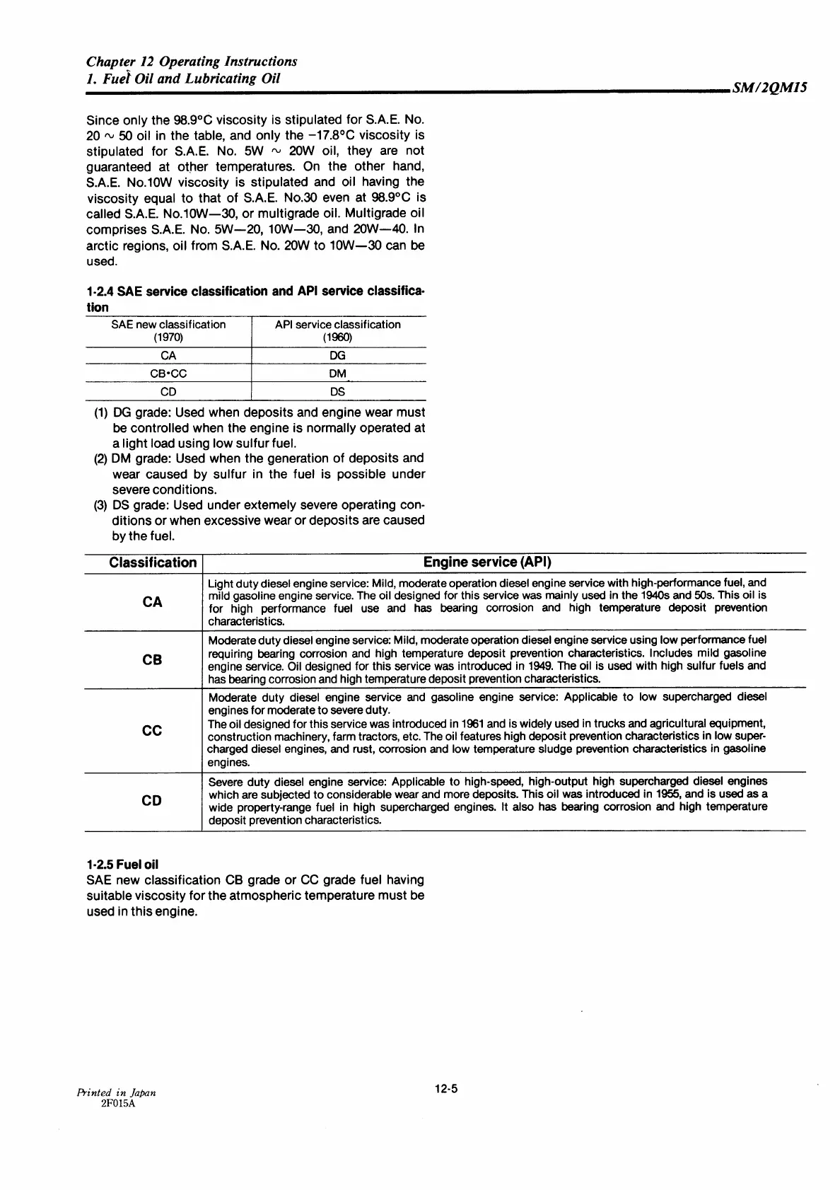 Yanmar 2QM15 - SAE Service Classification and API Service Classification