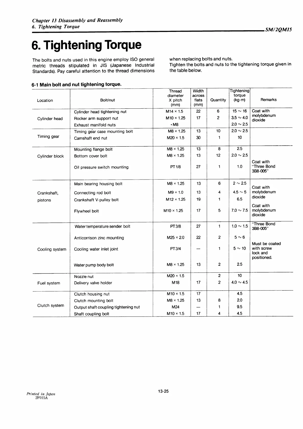 Yanmar 2QM15 - Tightening Torque; Main Bolt and Nut Tightening Torque