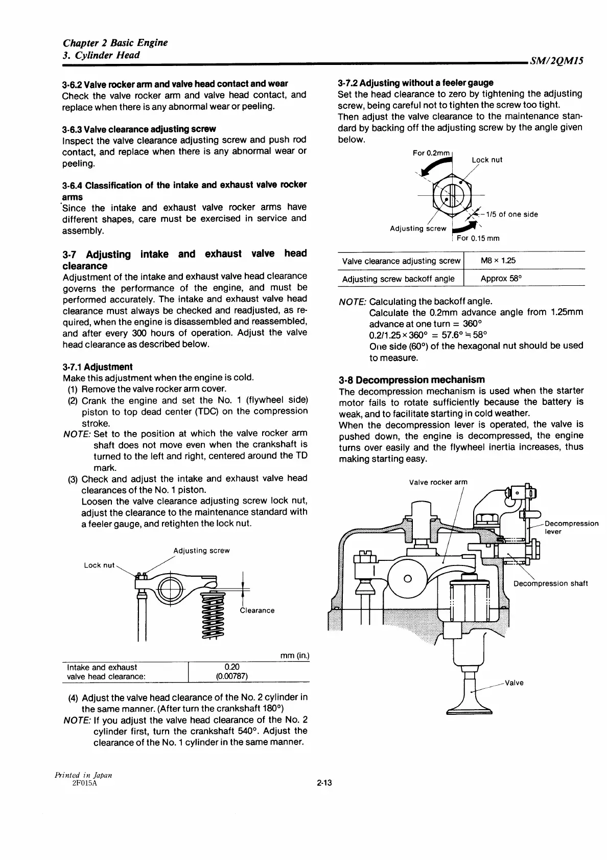 Yanmar 2QM15 - Adjusting Intake and Exhaust Valve Head Clearance; Decompression Mechanism