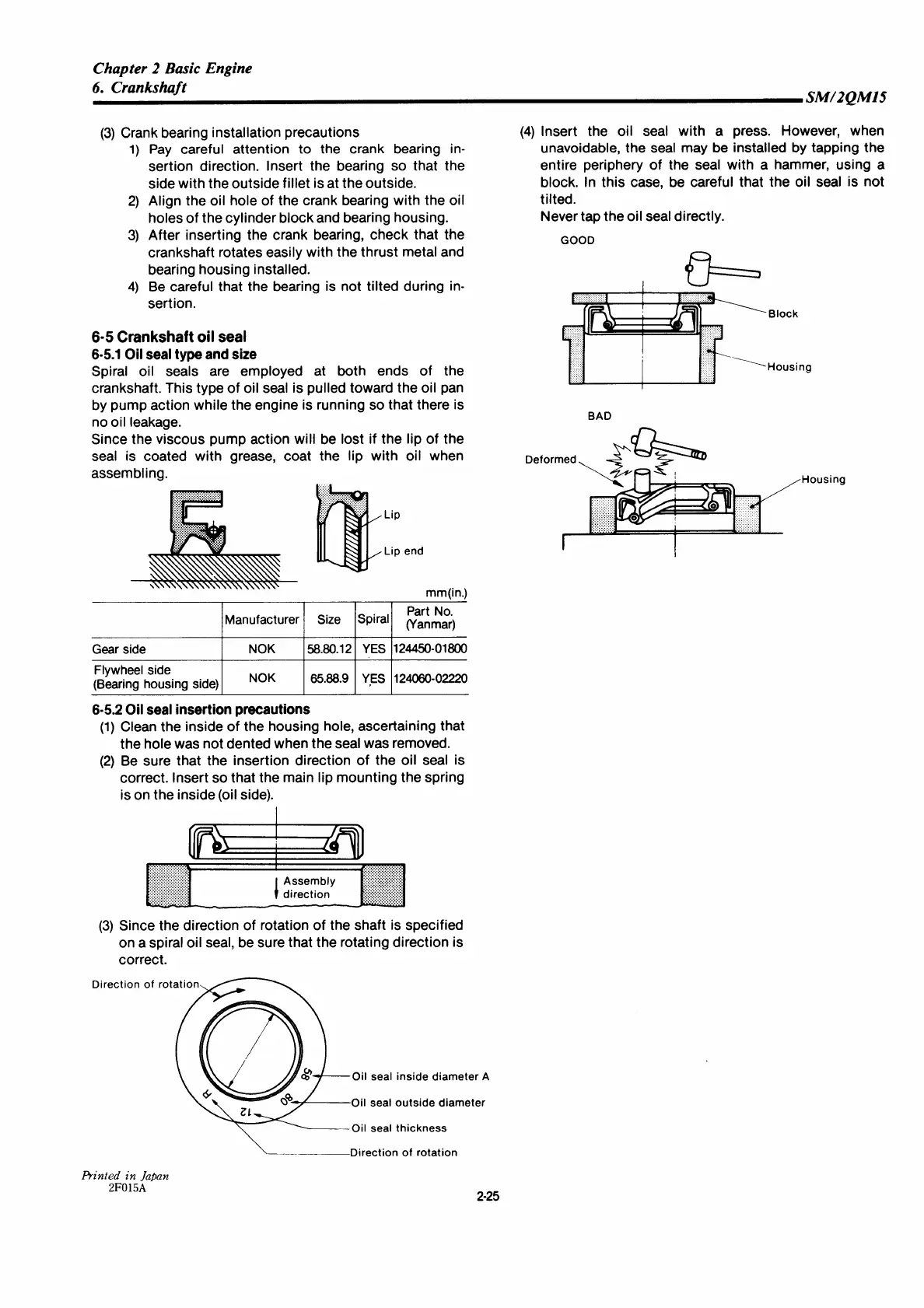 Yanmar 2QM15 - Crankshaft Oil Seal; Oil Seal Type and Size;Inserting Precautions